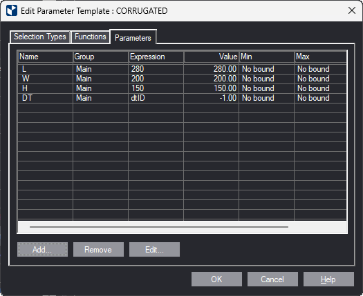 In drafting resizable designs, you might want to have routinely used parameters — for example, for width, height and length — handy for each new project and thus save yourself the effort of creating them each time you begin a new project. These parameters can be set in the parameter template of the material you are working with. Then, each time you start a resizable design from this material, you can load the parameters and then use them by simply changing their expressions.