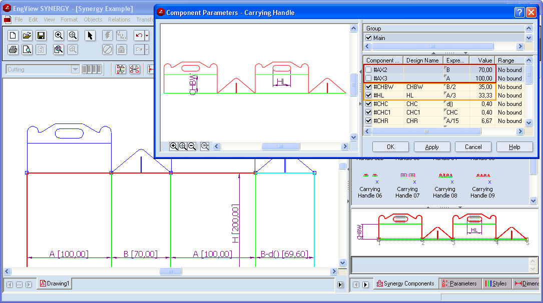 During the attachment of the component the program takes into account the distances between the second and the thirds clicks, and between the third and the fourth ones — these distances are reflected as values for AX2 and AX3. Since in the tabular area there are already parameters with the same values (A and B), the program links the AX2 and AX3 parameters with the parameters B and A, respectively. In this way, the parameters dependent on AX2 and AX3 in the compound component (CHWB and HL) are now dependent on the parameters B and A, respectively. This guarantees that every time the values of the parameters A and B are edited, the box's top will be correctly recalculated.
