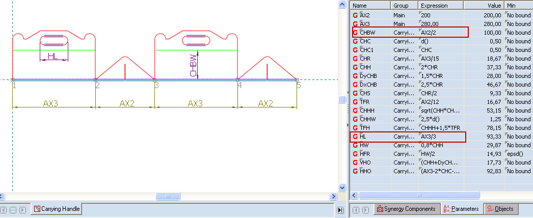 PICTURE 1. The parameters CHBW and HL belong to the compound component and are dependent on the parameters B and A, respectively, in the base. Originally, CHBW and HL were dependent on the AX parameters in the component, which, after the compound component has been attached, have taken the values of the base's parameters B and A.
