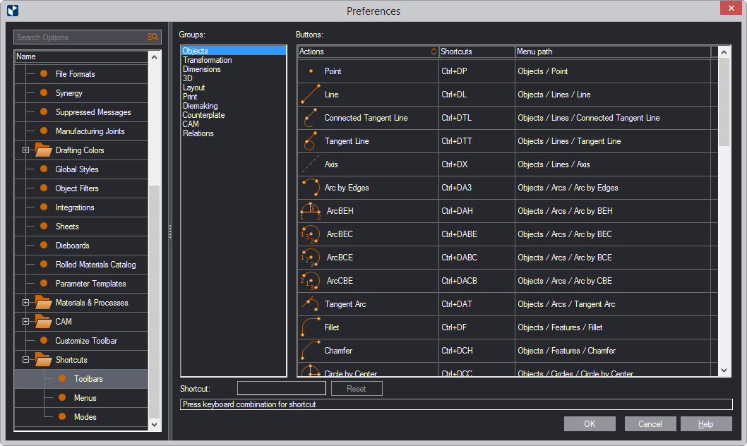 The Groups list shows the toolbars in the program as they are available in your configuration.